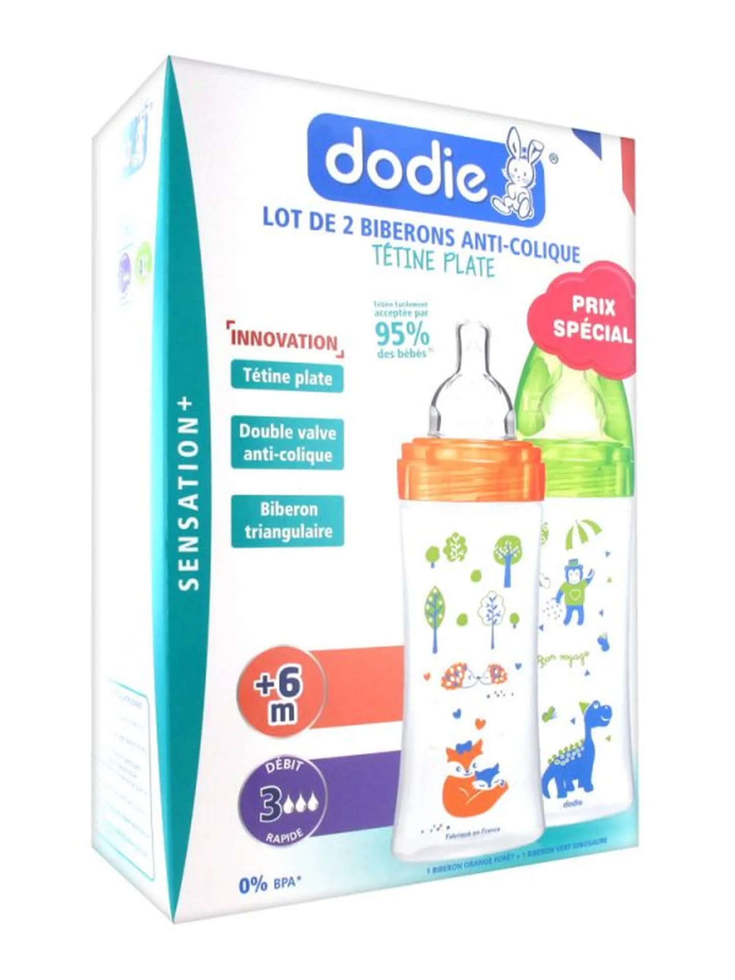 La technologie anti-colique est directement intégrée à la tétine (système double valve) et biberon en une seule pièce, anti-grumeaux, fabriqué en FRANCE.