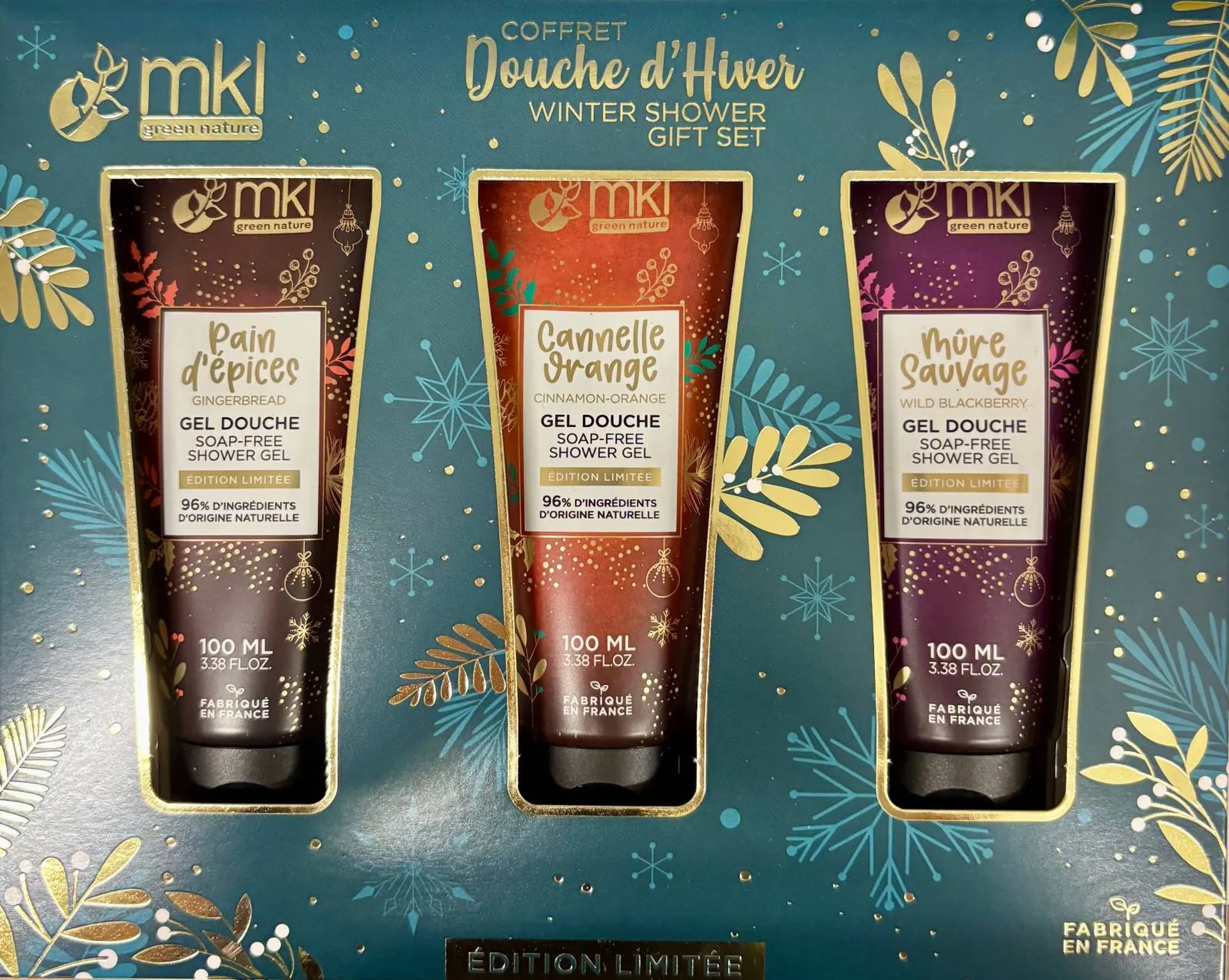 * Le Coffret Douche d’Hiver célèbre la saison avec des parfums épicés et réconfortants. Il comprend trois gels douches 100 ml aux senteurs emblématiques : Pain d’épices, Cannelle Orange et Mûre Sauvage. Ces fragrances chaleureuses transforment chaque douche en un véritable moment cocooning.