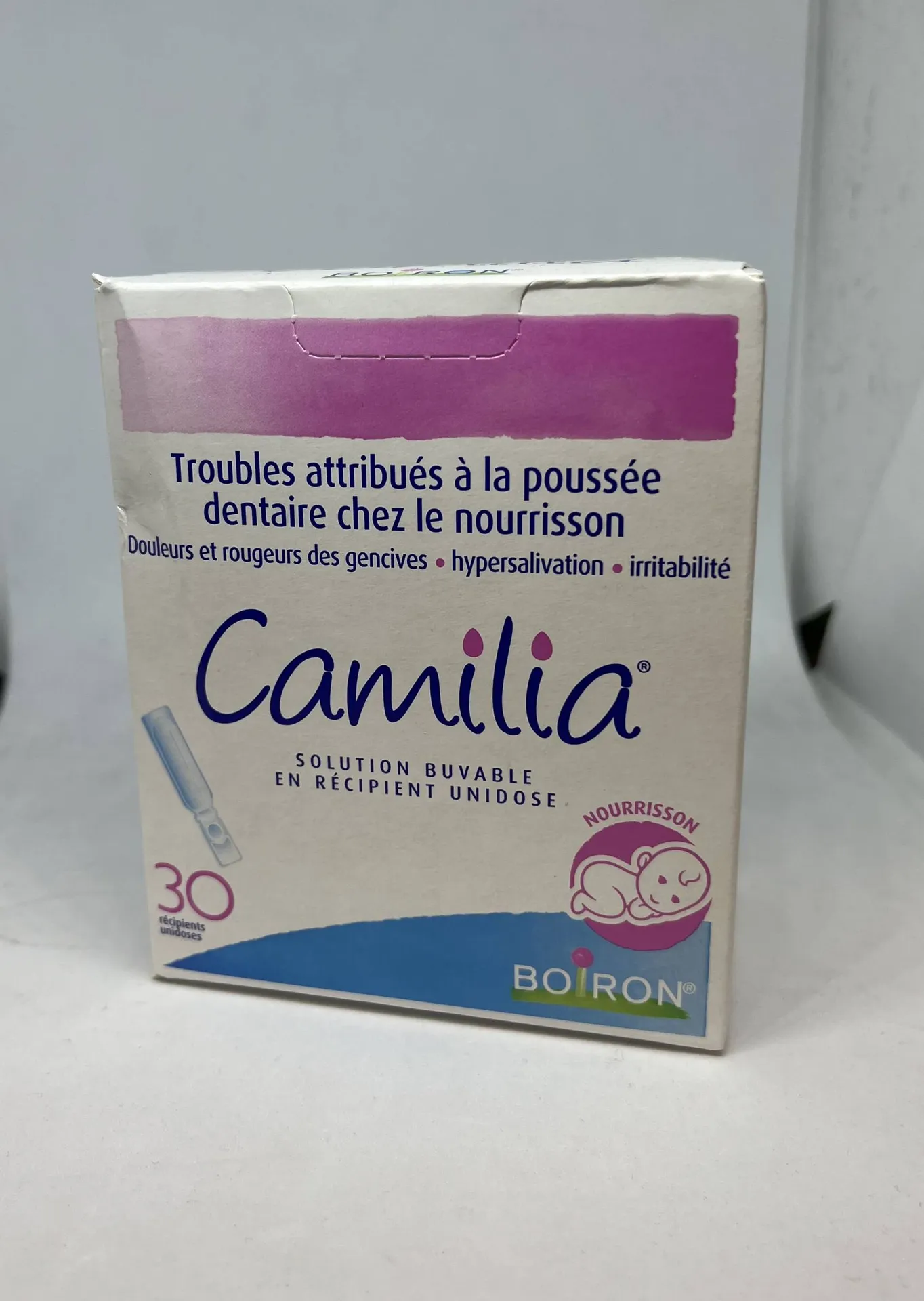 Facile à administrer, Camilia est une solution buvable en unidoses qui contribue à apaiser l’inconfort lié aux poussées dentaires et l’irritabilité. Sa composition douce convient parfaitement aux bébés. Cette solution doit etre délivrer au nourrisson entre 3 a 6 fois par jours