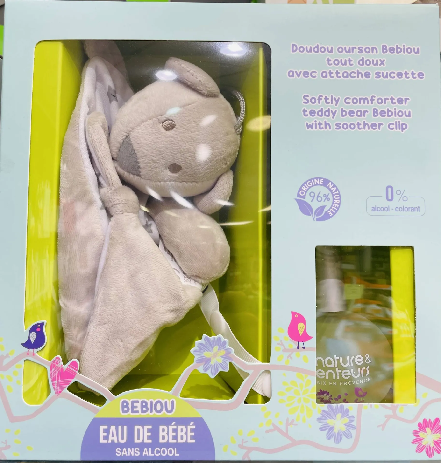 - L'eau de bébé 50ml BEBIOU sans alcool 96% d'origine naturelle, avec son doudou ourson tout doux avec attache sucette. Parfum mixte fille-garçon à vaporiser en nuage (10cm) après la toilette en évitant visage et yeux. Prix = 16,95€