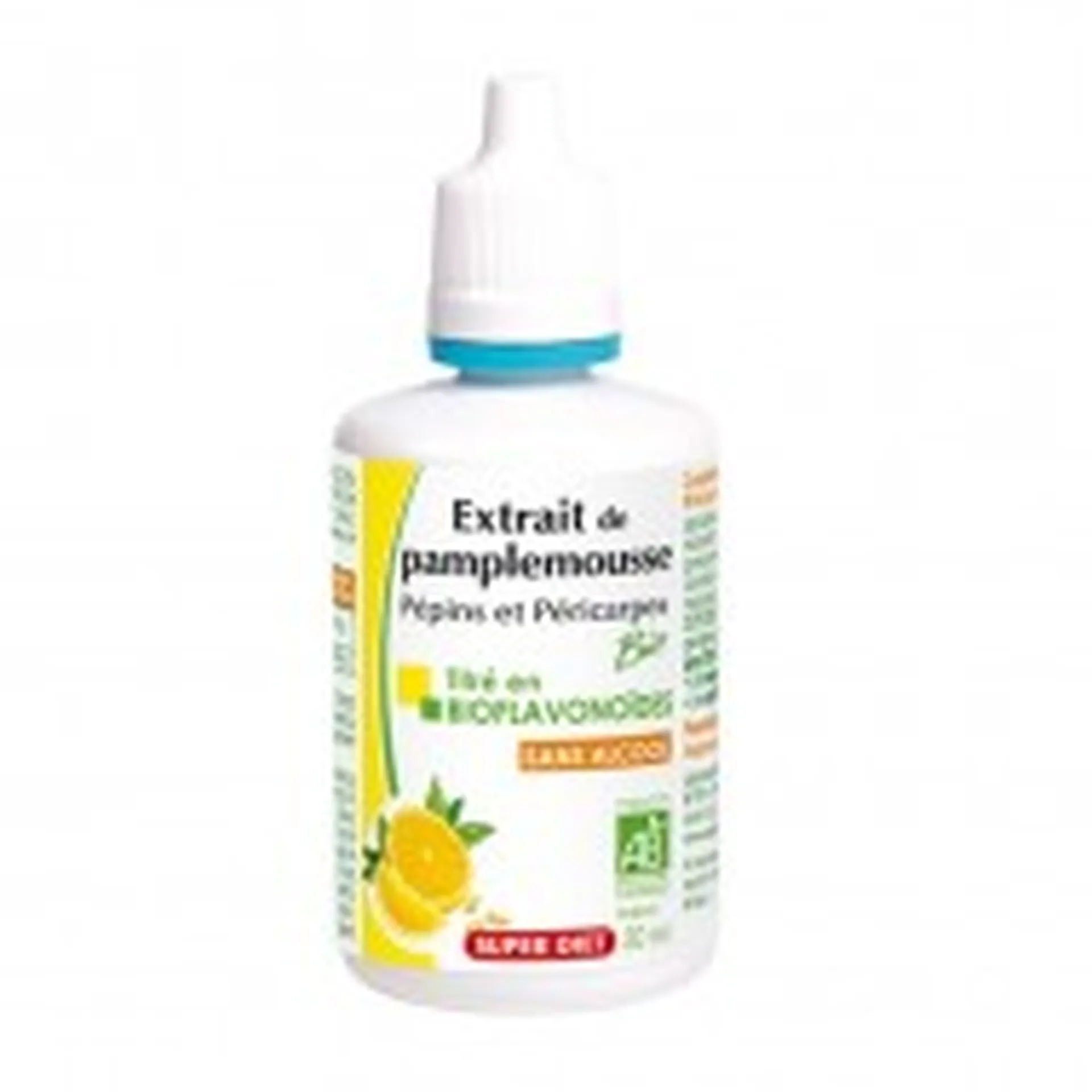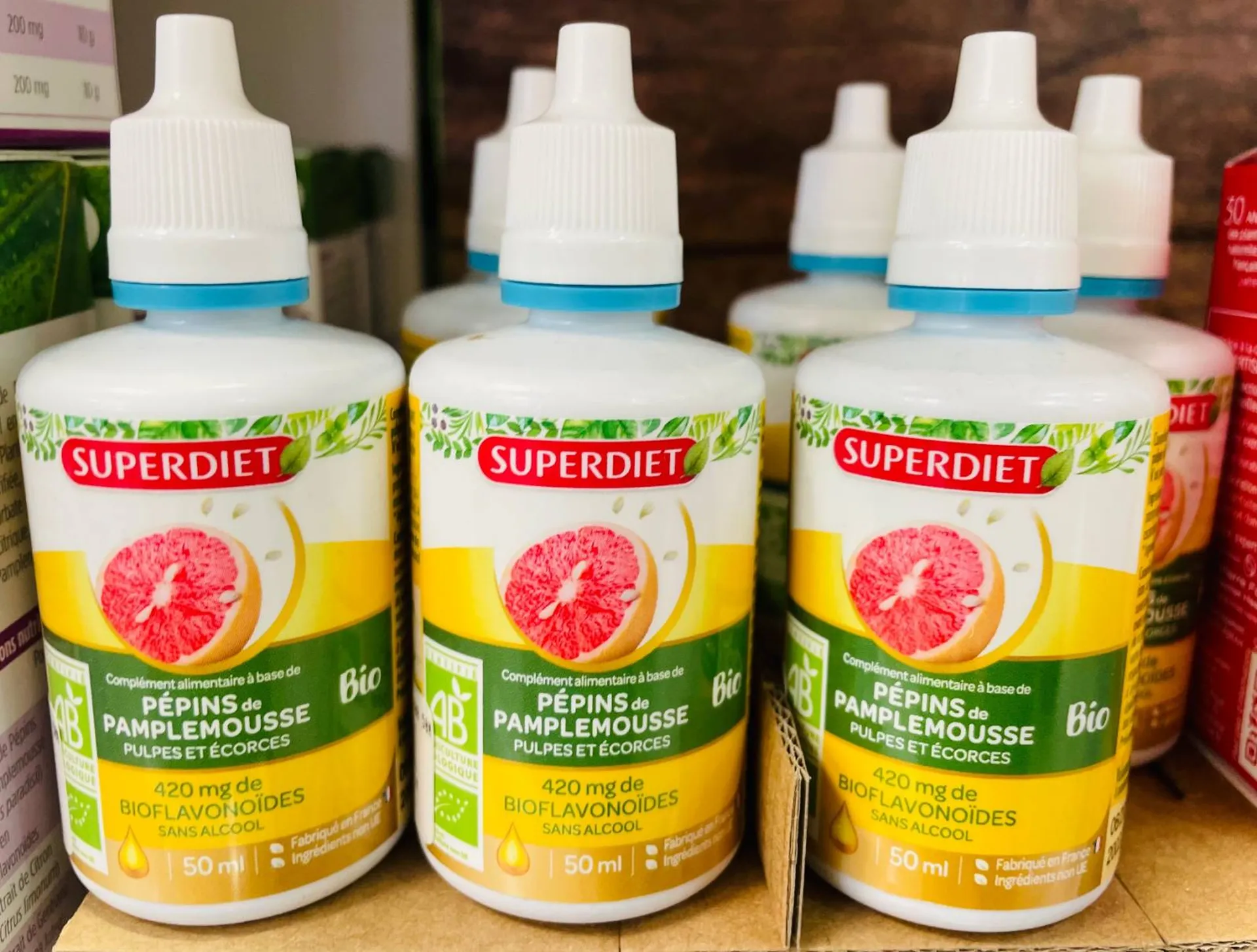 8,50 € le 50ml de superdiet BIO à base d'extrait alcoolique glycériné de pépins et de péricarde de pépins de pamplemousse BIO et extrait d'acérola pour augmenter la résistance de l'organisme contre les agressions extérieures.
