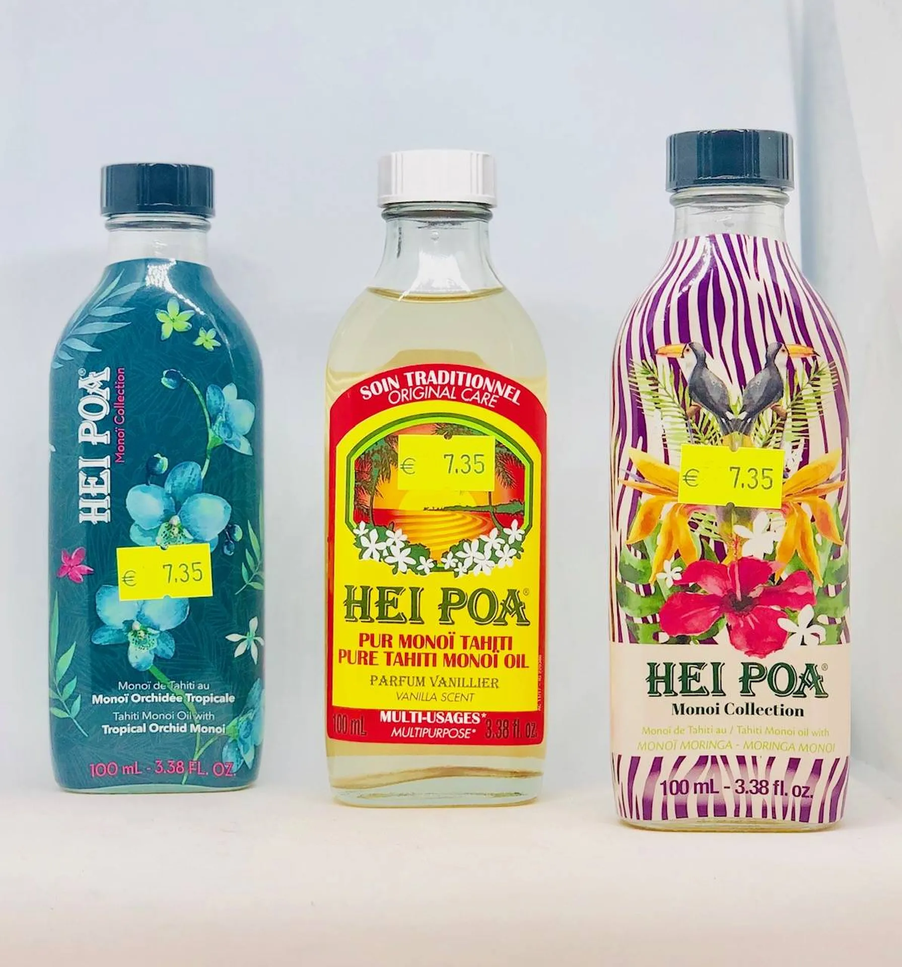 -HEI POA: Pur monoï de Tahiti AO: Au parfum Vanillé, l'huile est composée de fleurs de Tiaré et huile de Corpah. Le pur monoï de Tahiti est un soin multiusage, il est utilisé afin d'adoucir et réparer peau et cheveux. Contenant 95% de Monoï de Tahiti d'appelation d'origine, cette huile sublimera votre bronzage. Son prix est de 7,35€ pour un flacon de 100 ml